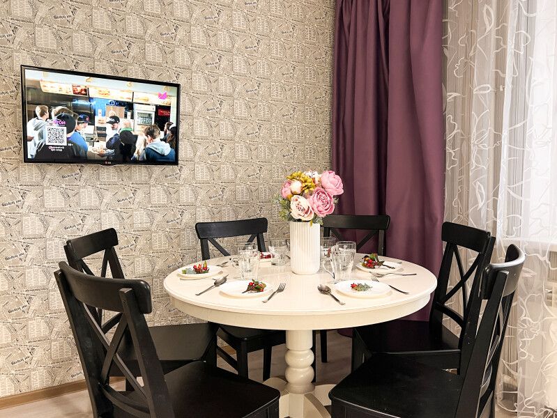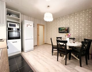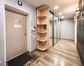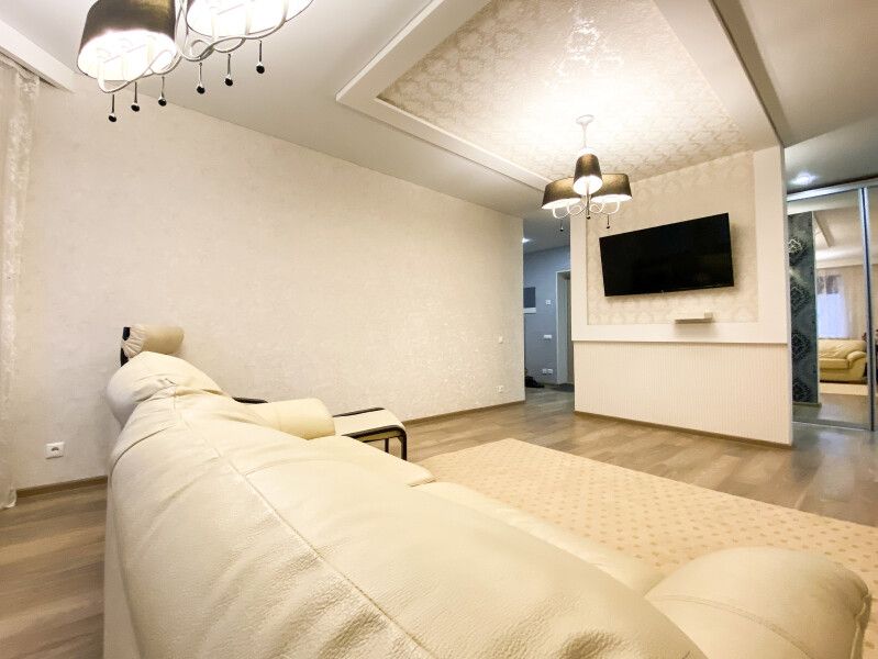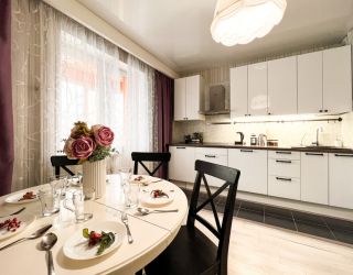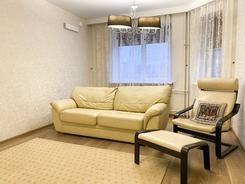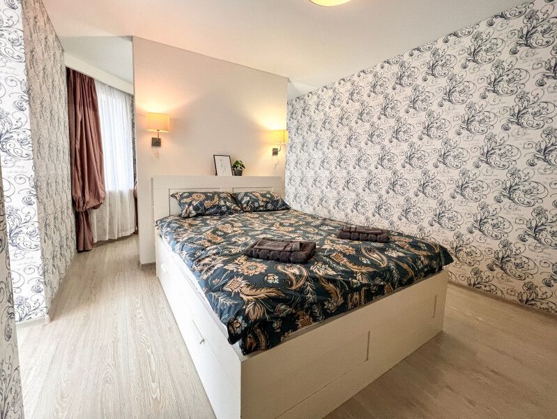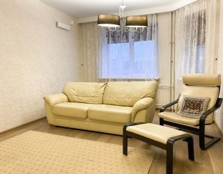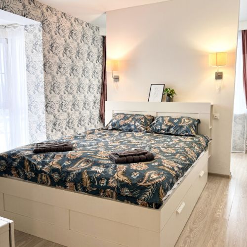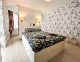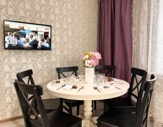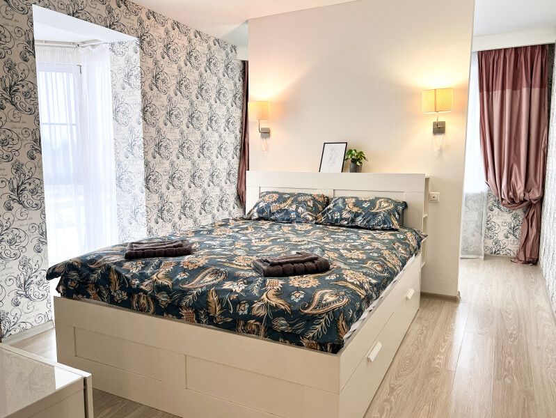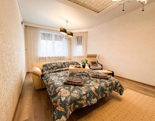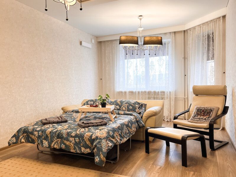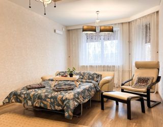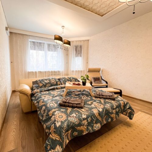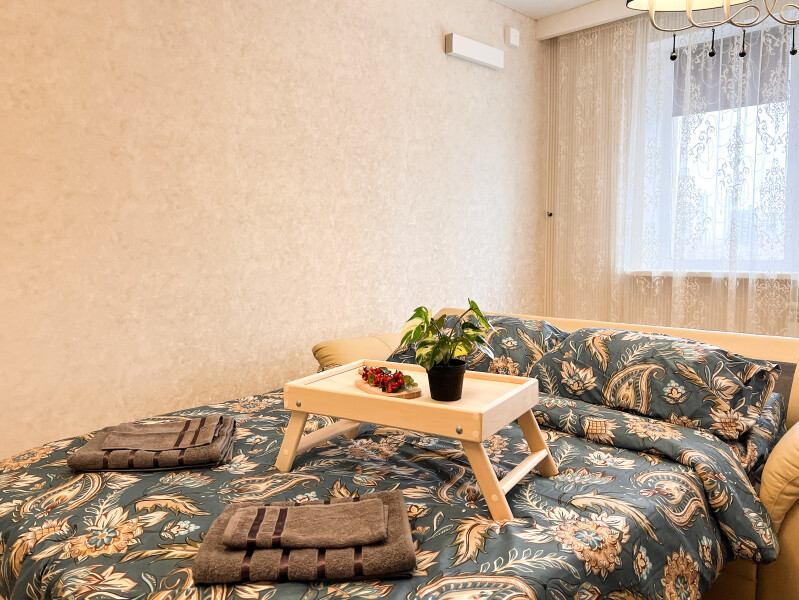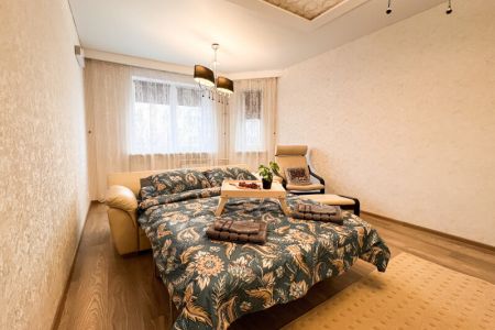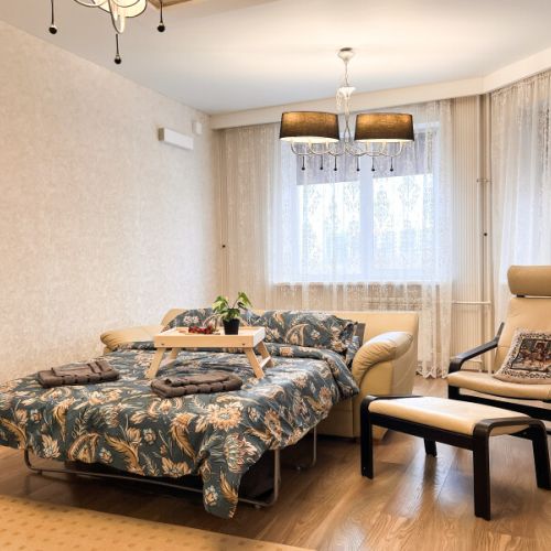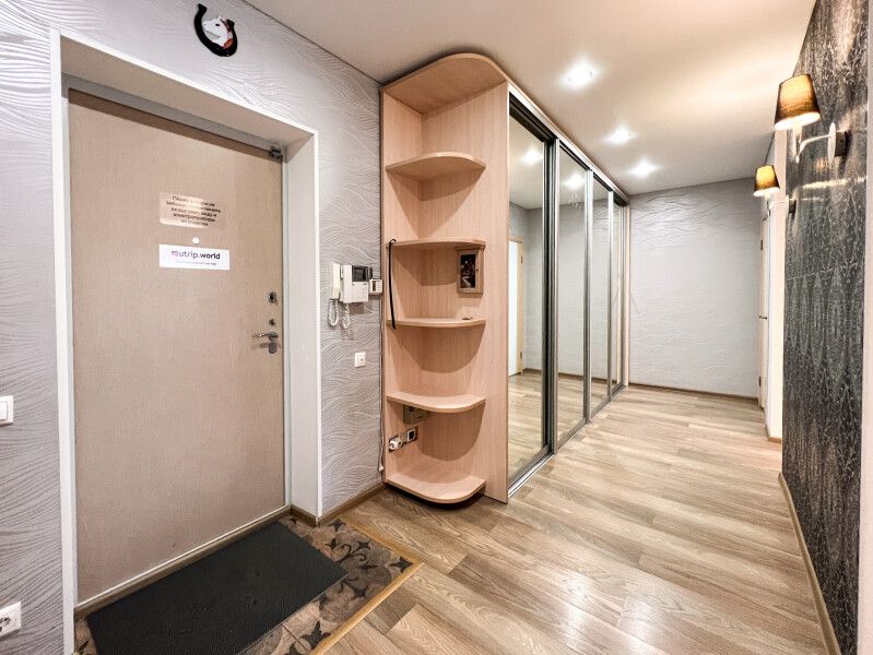 В изолированной спальне установлена двуспальная кровать, в просторной гостиной — раскладной диван. Кухня оснащена пространством для приготовления еды, посудомоечной машиной, обеденной зоной. Прихожая располагает вместительным шкафом-купе с большими зеркалами. Совмещенный санузел укомплектован ванной и стиральной машиной. Гости могут подключиться к Wi-Fi.